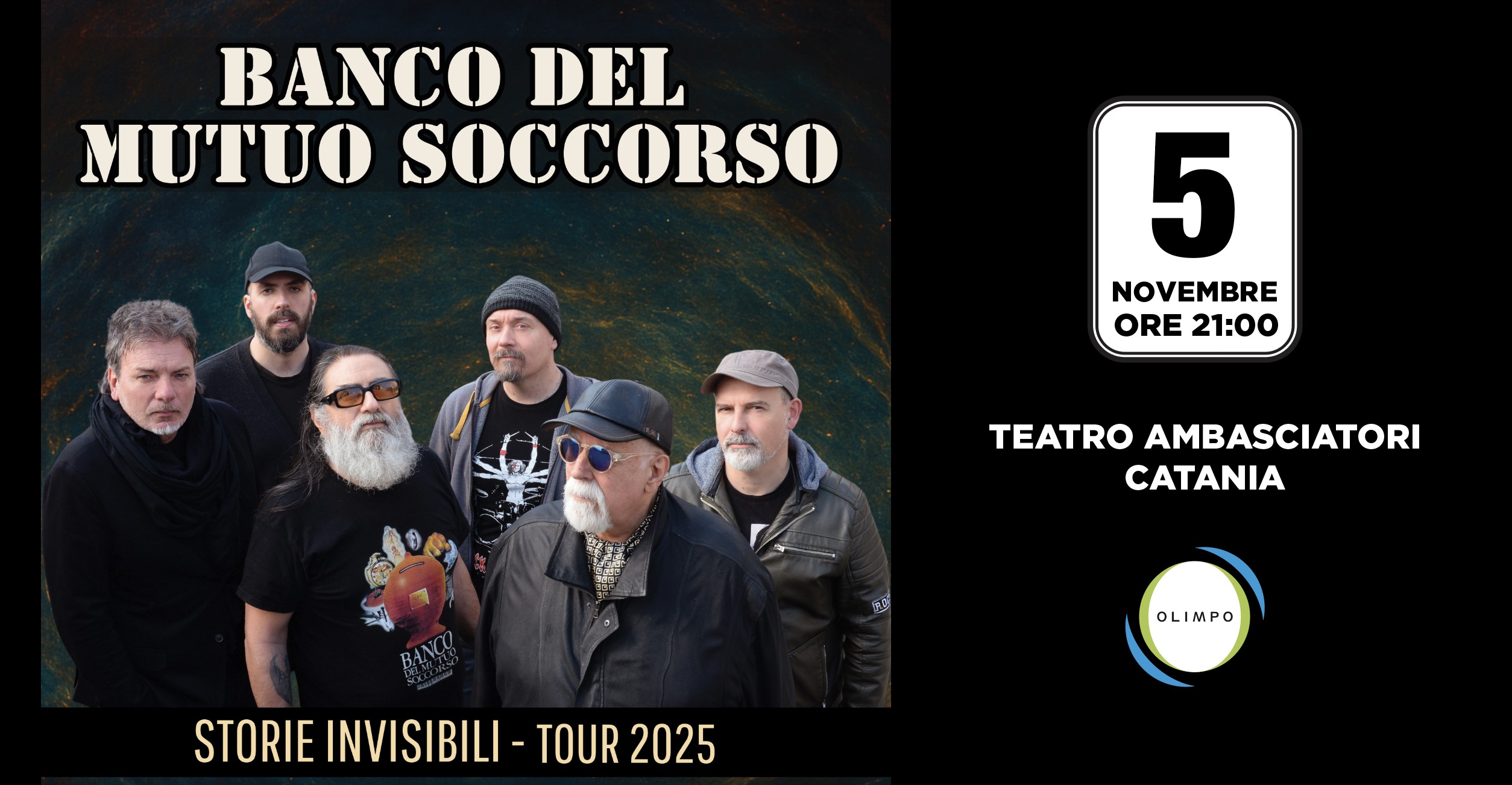 Eventi Olimpo, organizzatore delle date del concerto “Banco del Mutuo Soccorso – Storie Invisibili Tour”, comunica, per sopraggiunti ed inderogabili motivi di carattere organizzativo, l’annullamento degli spettacoli in programma il 5 Novembre al Teatro Ambasciatori di Catania, il 6 Novembre al Palacongressi di Agrigento ed il 7 Novembre al Teatro Al Massimo di Palermo, non imputabili in alcun modo agli artisti né alla loro produzione.